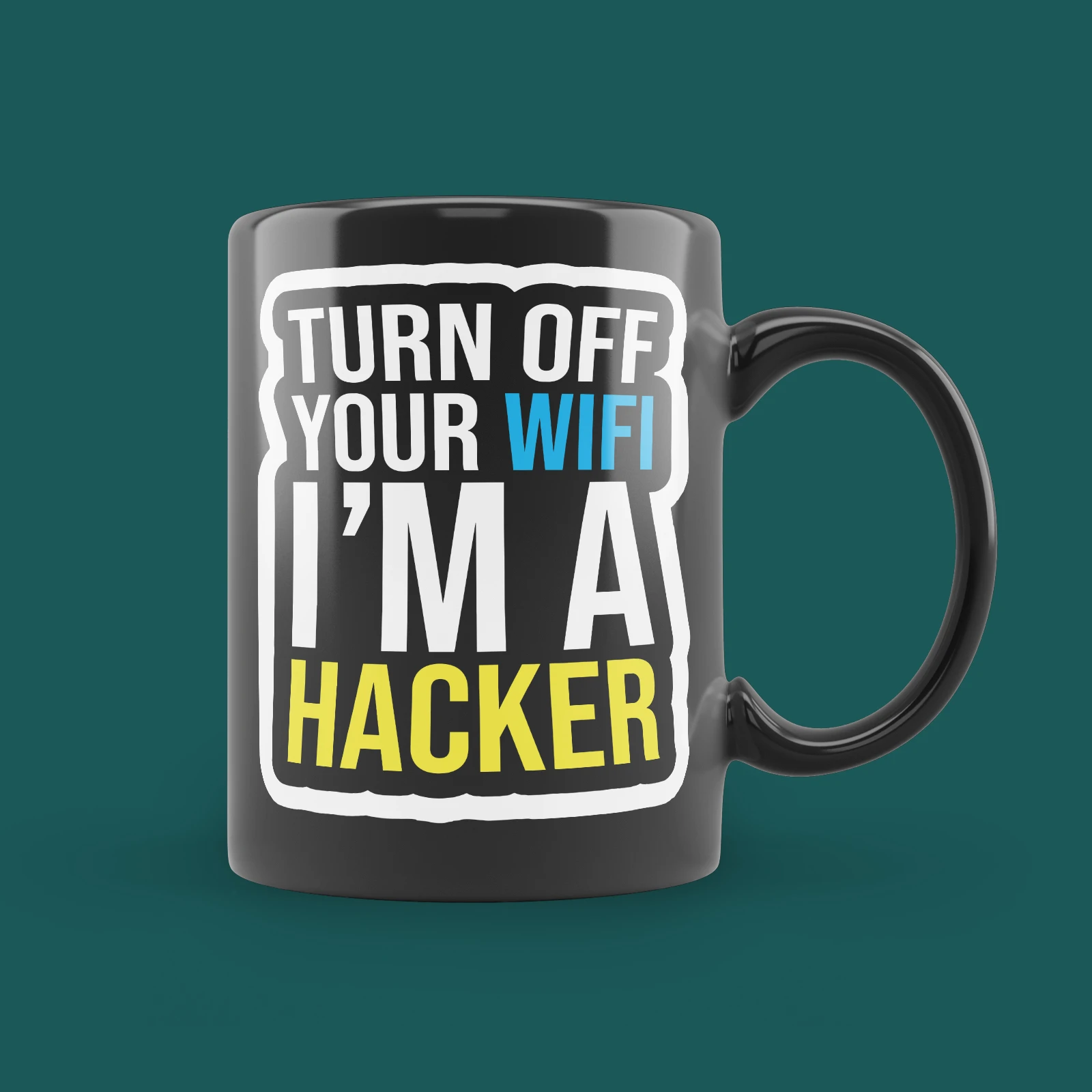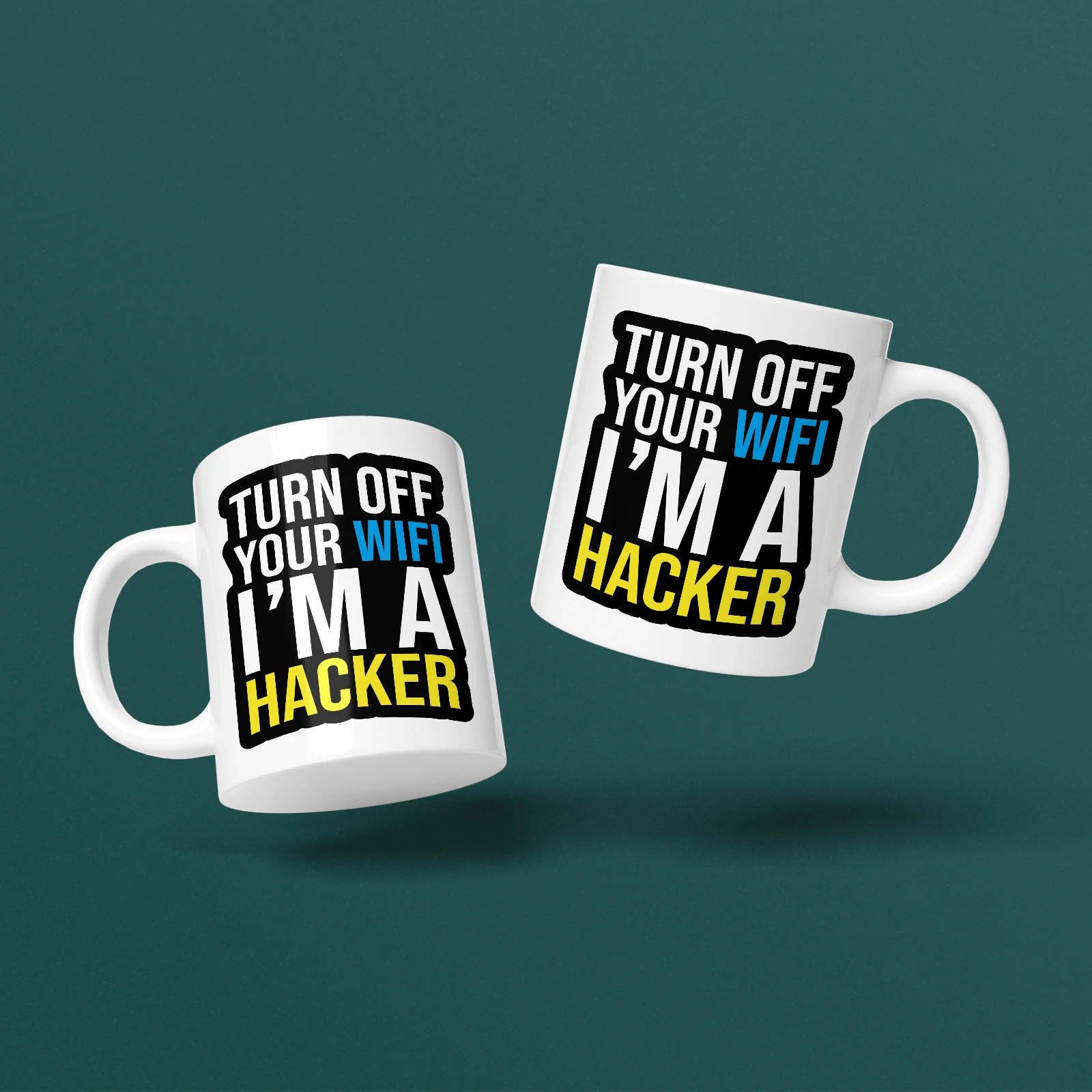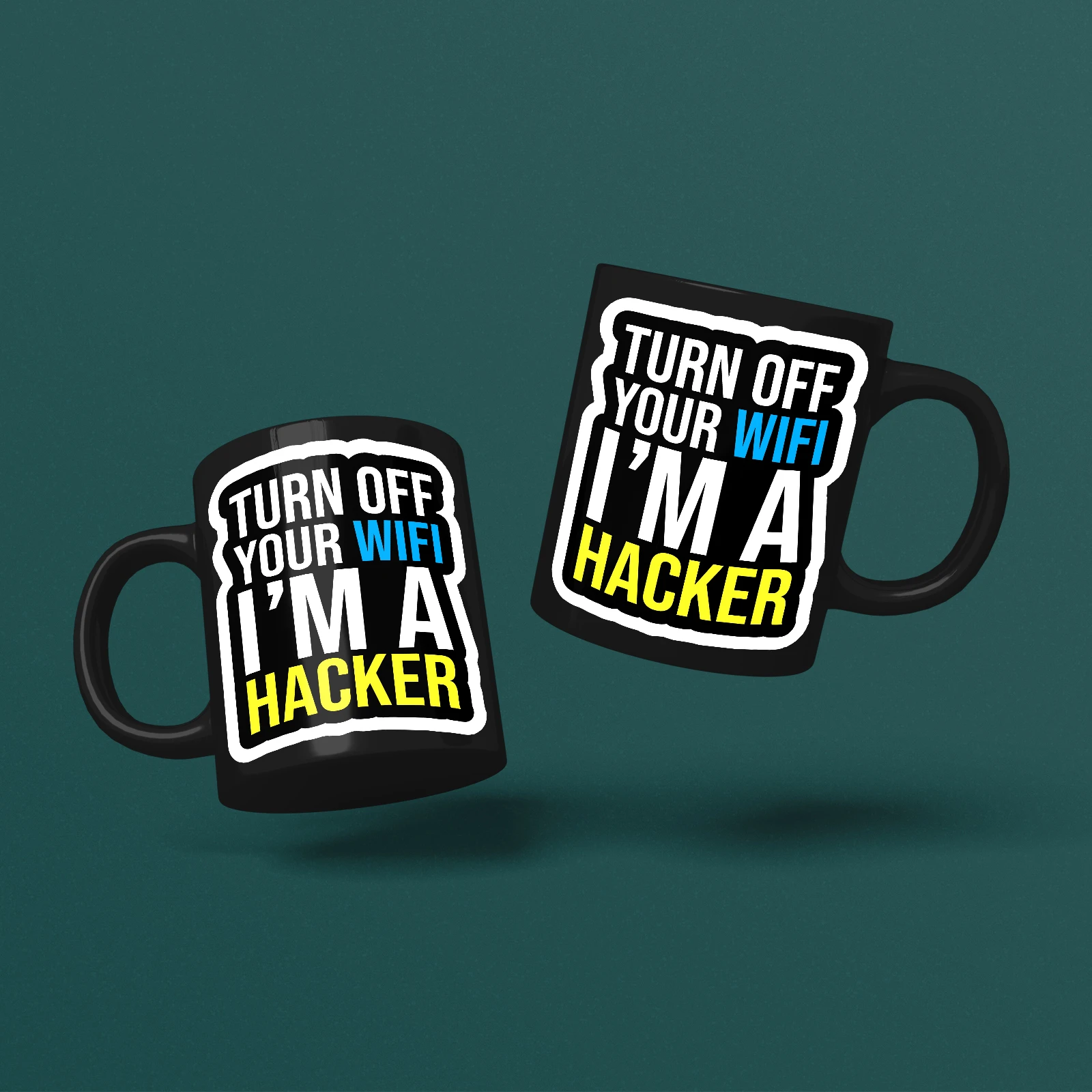 With the bold line “TURN OFF YOUR WIFI, I’M A HACKER”, it blends humor with hacker culture.