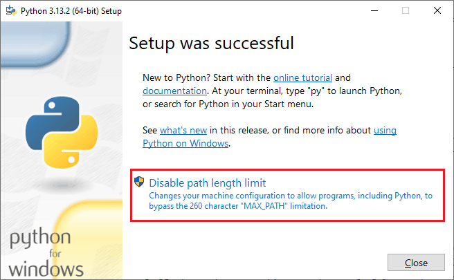 در صورتی که پس از نصب، پنجره زیر ظاهر شد، روی گزینه Disable path length limit کلیک کرده و سپس روی دکمه Close کلیک کنید.