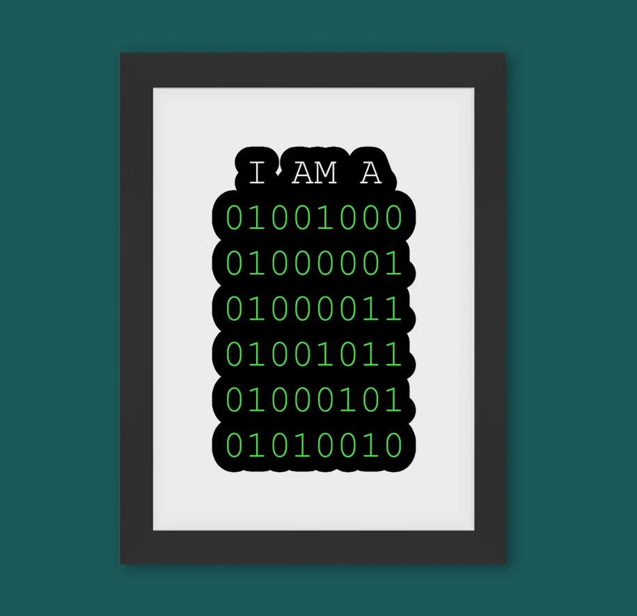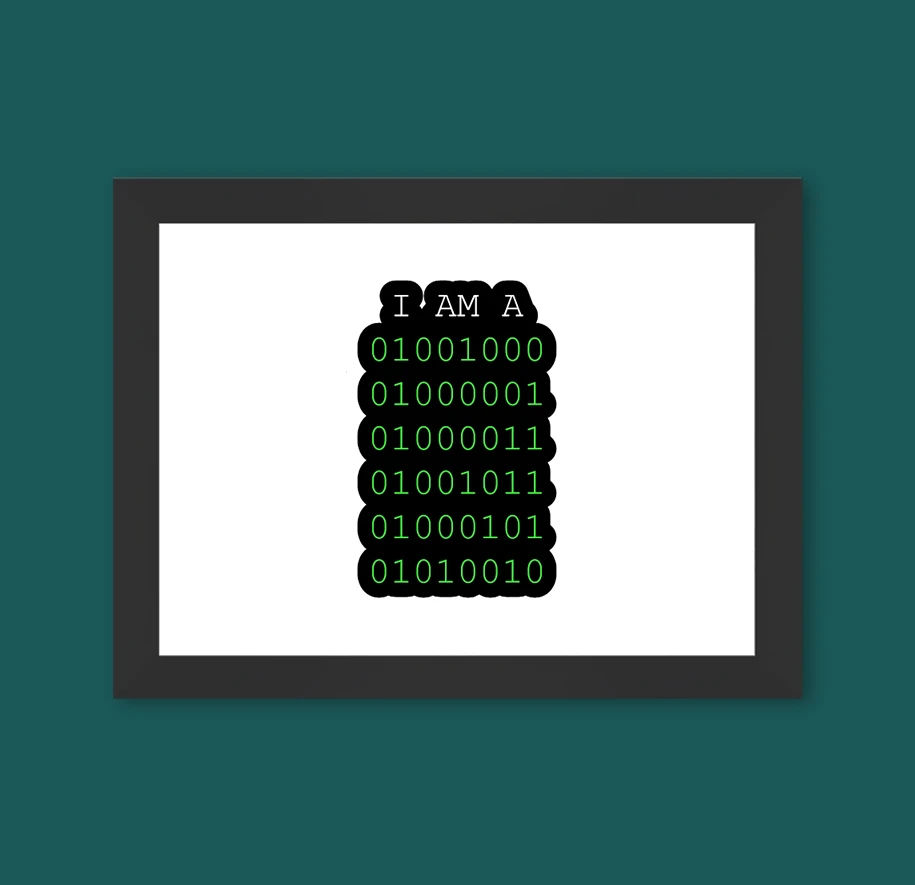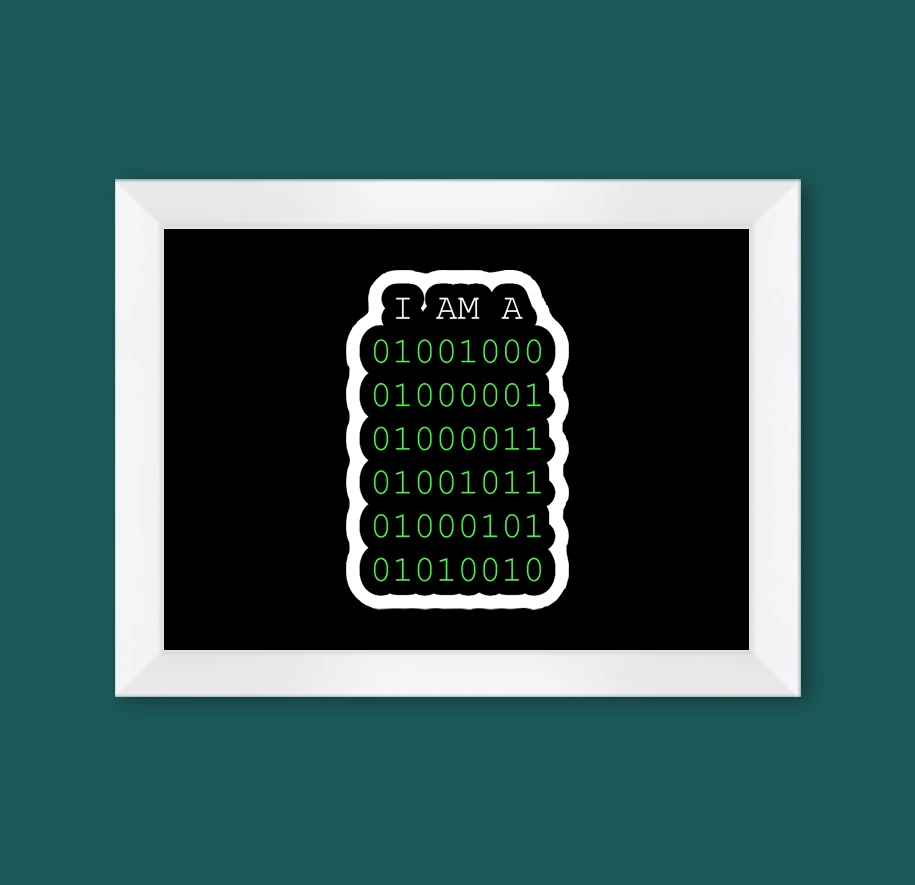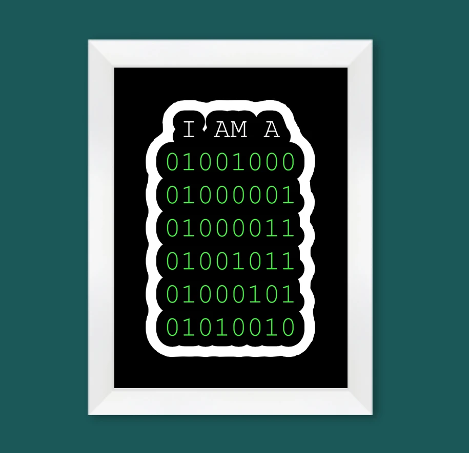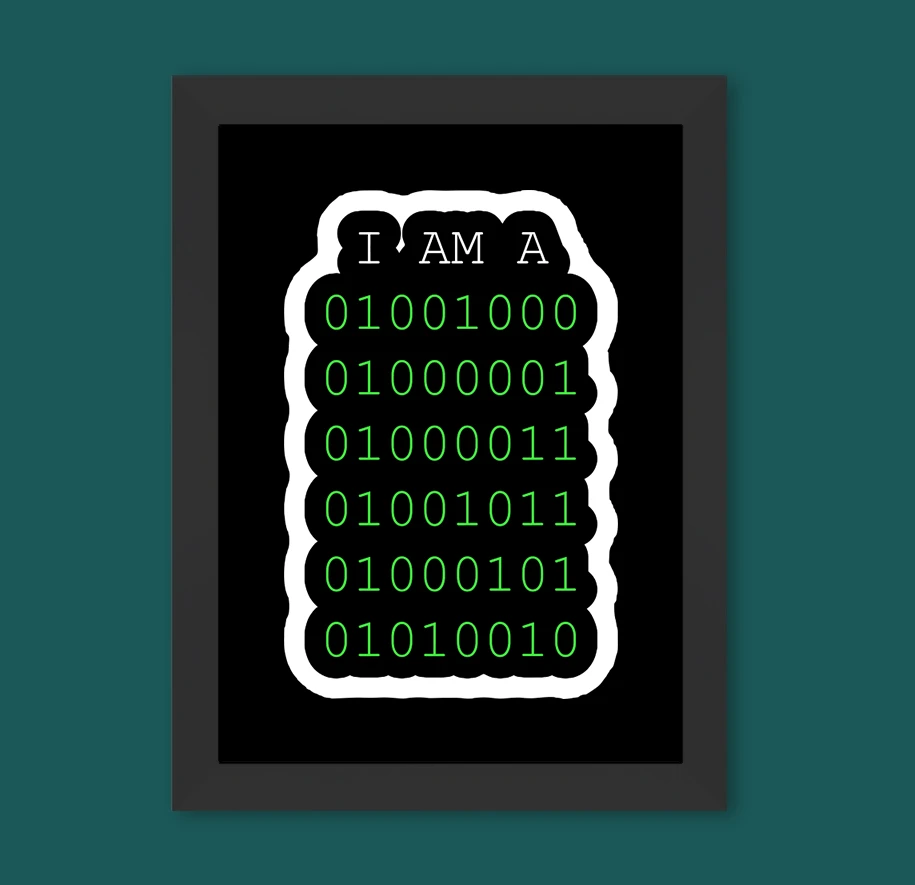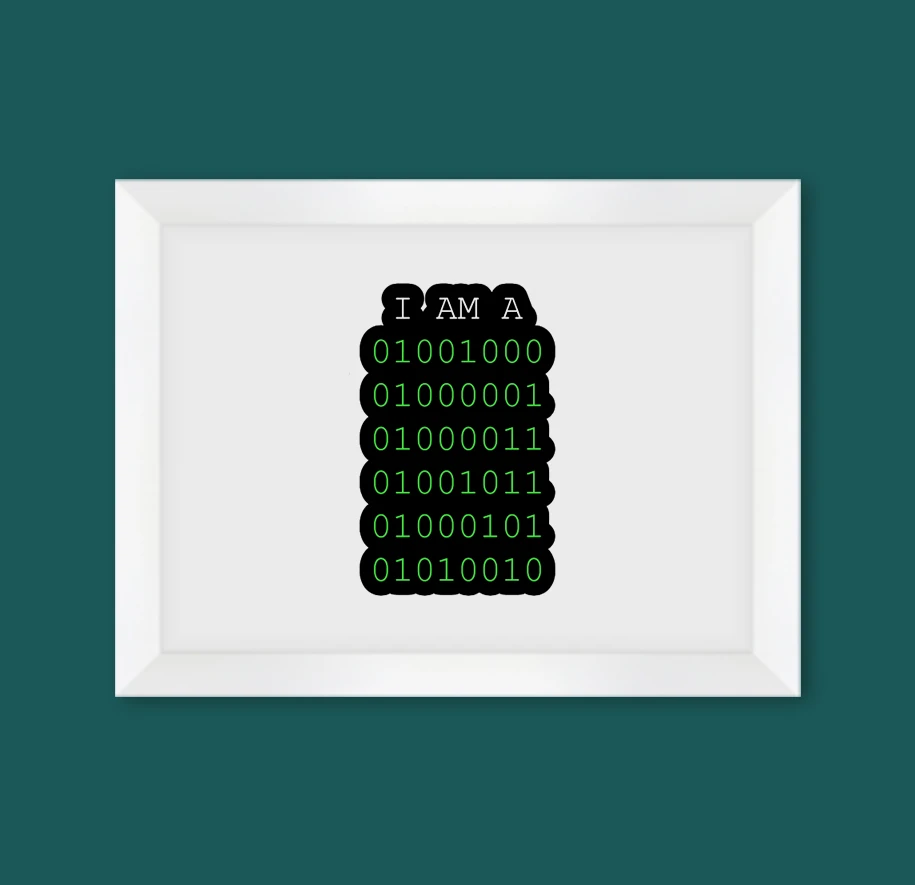 این تابلو با جمله “I AM A HACKER” که به صورت باینری (۰ و ۱) نوشته شده،