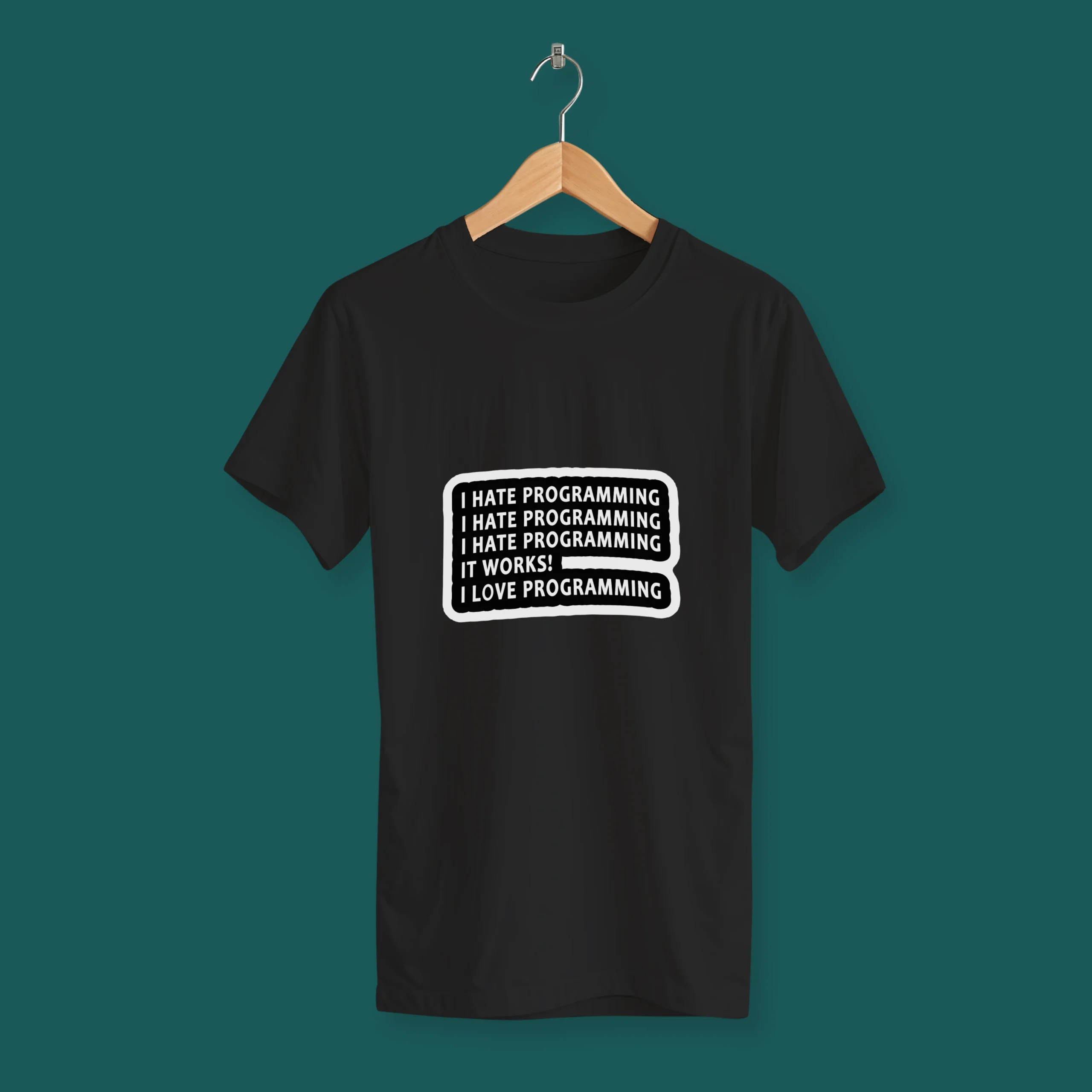این تیشرت چرخه معروف برنامه‌نویس‌ها رو نشون میده: از “متنفرم از برنامه‌نویسی” تا لحظه جادویی “کار کرد!” و بعد “عاشقشم” 🤯❤️