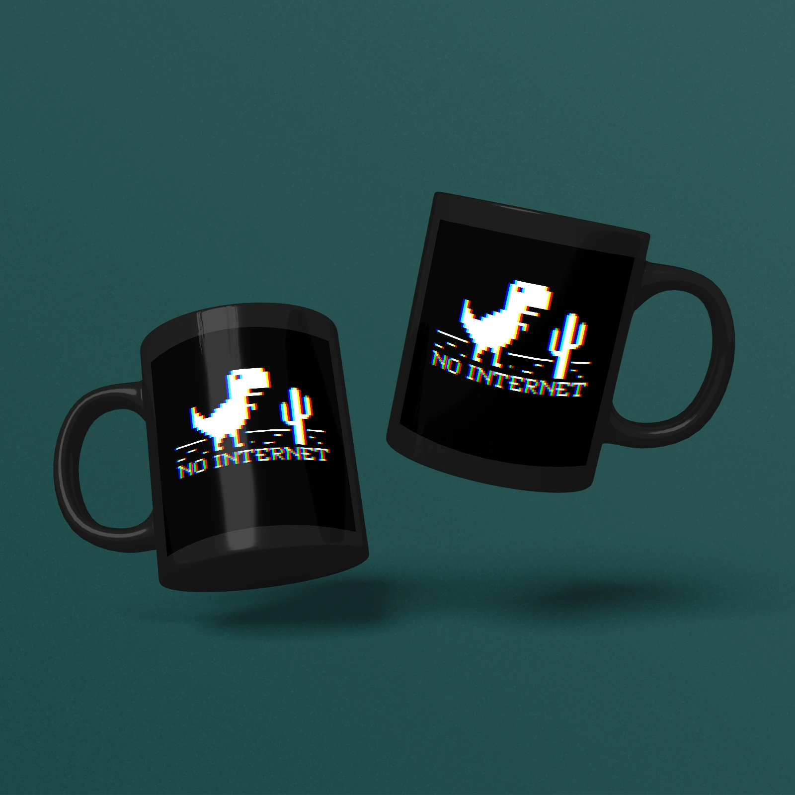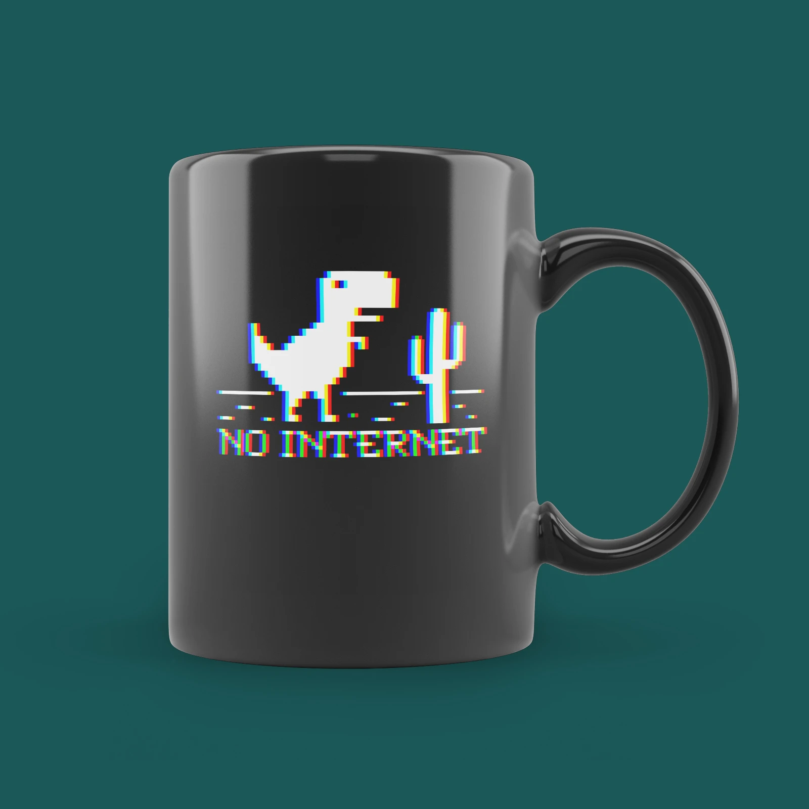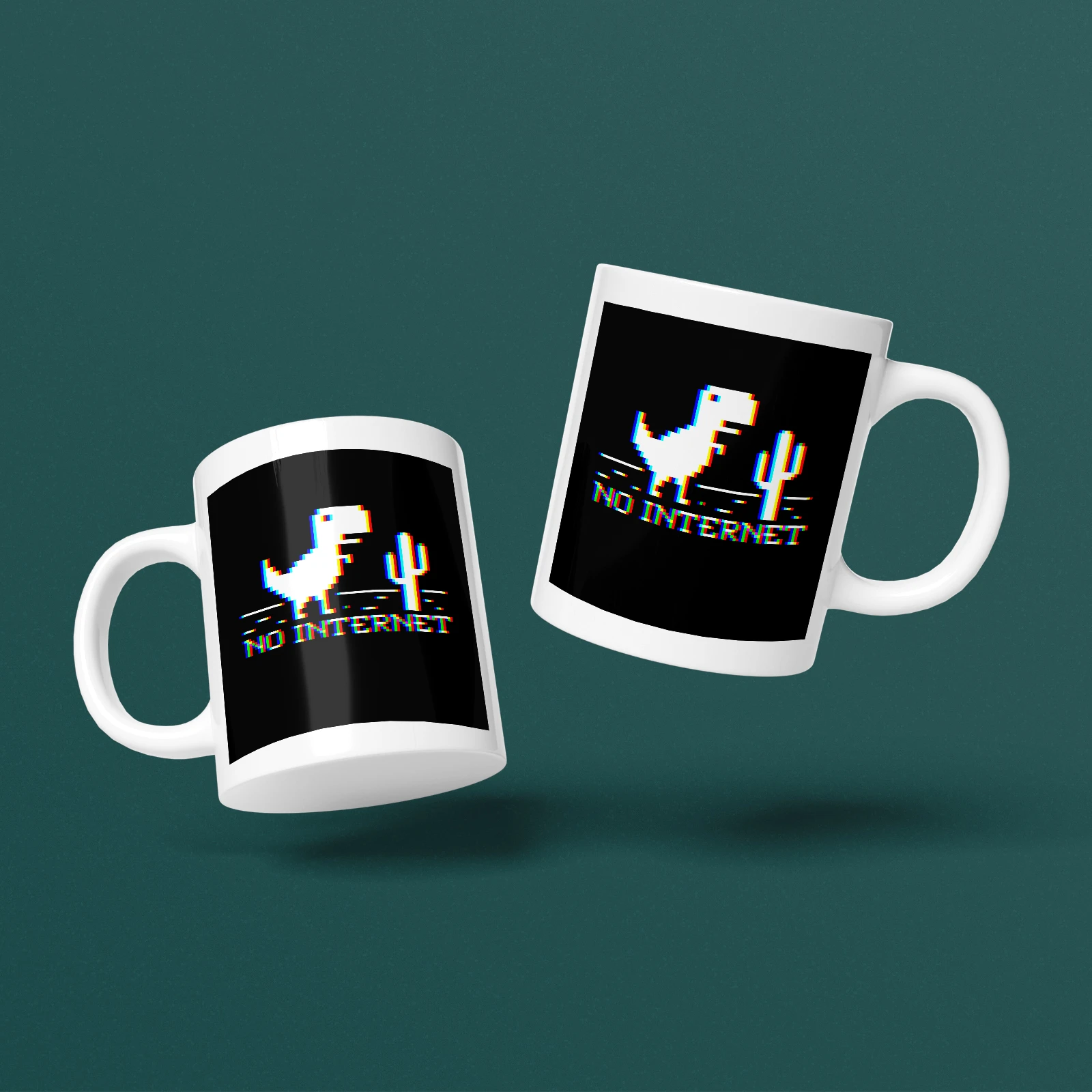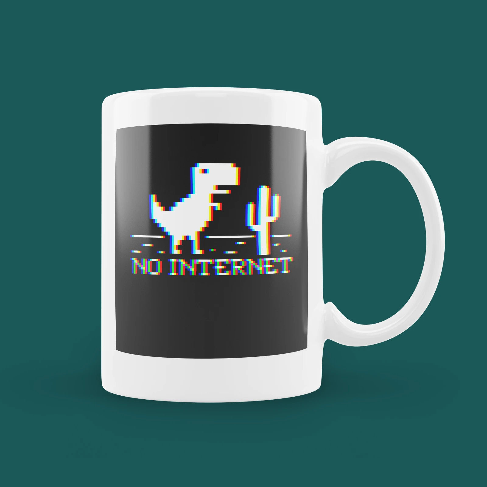روی این ماگ تصویر نمادین دایناسور گوگل با متن NO INTERNET چاپ شده؛